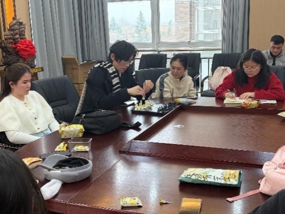 分享环节结束后,自由讨论环节将现场气氛推向高潮。同学们围绕 “中西娱乐方式的差异”“现代科技对传统娱乐的影响” 等热门话题,用中英日等多种语言各抒己见,思想的碰撞中尽显跨文化交流的活力。更有同学特意带来国际象棋,邀请在场师生围坐对弈:有人耐心讲解规则,有人踊跃尝试落子,棋盘上的每一步互动,都成为跨越语言障碍的交流纽带。现场笑声、讨论声此起彼伏,原本陌生的学子因共同的兴趣渐渐熟络,真正实现了 “以娱乐会友,以交流传情” 的活动初衷。