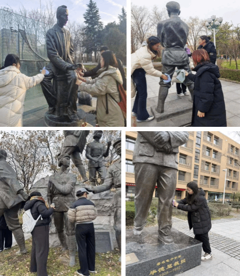 活动开始后,各组同学携带清洁工具,有序抵达雕塑所在处。他们手执毛巾俯身擦拭,从塑像身躯到基座台面,不遗漏每一处细节。尘灰拭去,光泽重现,历史的轮廓在手中逐渐清晰。
