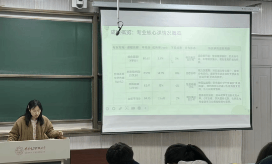 会上,辅导员赵璐老师首先对 25 级外国语言文学大类和日语专业的核心课成绩进行全面细致的概览分析。数据显示,同学们已顺利度过入学适应期,核心课程呈现 “优秀率提升、中层收缩、无不及格” 的良好态势,但仍有许多同学面临高阶听说理解能力短板的困扰,需要针对性加强。日语专业初期的模仿红利在逐渐消退,赵璐呼吁日语专业同学提高警惕,不要被基础日语的高分迷惑,重视综合发展,及时补齐能力短板。