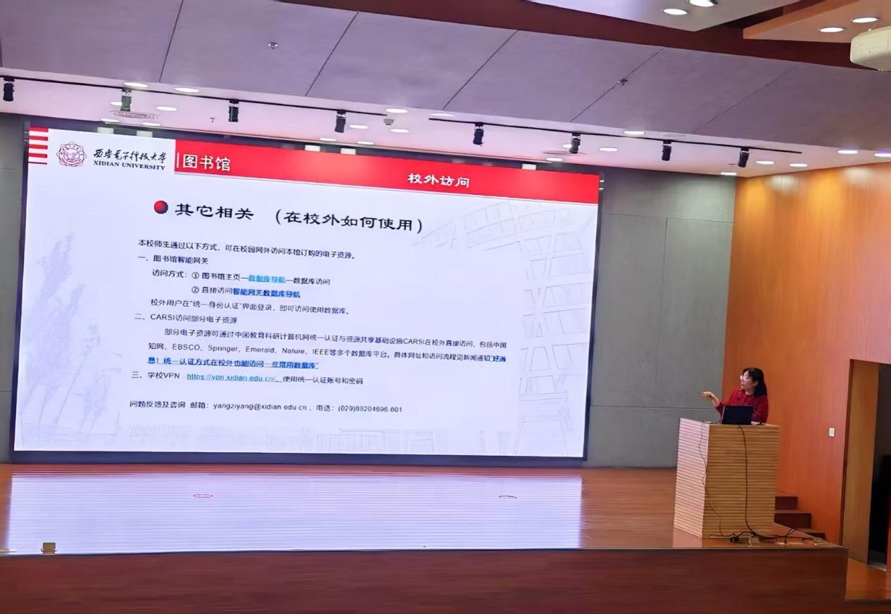 在数字资源讲解环节,尚博结合图书馆各类资源板块,逐一介绍了馆内核心数字资源,重点推介了维普科技期刊全文库、CSSCI中文社会科学引文索引数据库、超星发现系统、科学文库等中文数字资源,以及Springer、WOS平台等核心外文数字资源,充分贴合外语专业的学习与研究需求。她还结合外语专业特色,为同学们梳理了适配专业学习的优质学术资源,精准提供了专业学习所需的资源方向与获取路径。同时,尚博详细讲解了校外访问图书馆资源的具体方式,细致分享了查询中文、外文学术资源的方法,指导同学们该如何高效查找适配专业的学术资源,还着重强调在使用知网、各类外文数据库时,一定要遵守使用规范,做到合理合规利用学术资源。