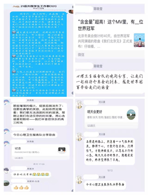 在心理队负责人黄佳琦同学的组织下,创建了匿名树洞群。进群的同学采用匿名的形式,随时随心地说出自己的苦恼,心理队的成员主动帮助提出困扰的同学解决问题,大家相互安慰、抱团取暖。心理队的成员们定期在工作群分享有关心理、卫生的视频、文章,让大家更好地了解自己、调节自我。(一个关于从认清情绪开始来正确面对我们的情绪的小视频,来帮助大家在现在的压力环境下正确处理消极情绪;一首《纪念》,让我们用心去聆听、用心去感受曾经的美好,回忆曾经的酸甜苦辣;一篇描写即将到来的冬奥会以及一篇讲述中国制造的发展历程,无形中给我们吃下了定心丸,相信我们一定可以战胜困难……)