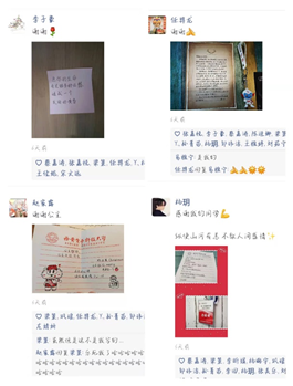 当天晚上,葛桐同学设计调查问卷并转发至班级群,向同学们征集遇到的问题和困难,得到了同学们的积极回复。崔昊言同学每天在工作群为大家分享正能量推文为大家加油鼓劲。12月26日晚,小组成员将收集到的抗疫相关的知识资料打印并分发至每个宿舍,并在抗击疫情倡议书上签字,同时让同学们随机抽取了提前收集好的手写贺卡,以温暖而又不缺乏仪式感的方式号召大家注意防护、积极抗疫!