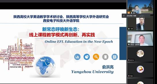(通讯员:陈万庆)2022年4月27日下午,根据学院工作安排,我校外语教育数字化研究院院长杨跃教授特邀扬州大学副校长俞洪亮教授在线上为我校外语教师做了题为“新常态呼唤新生态:线上课程教学模式再创新、再实践”的讲座。讲座由杨跃教授主持,外语学院执行院长马刚教授在讲座开始前致欢迎辞,代表学院对俞教授在百忙之中拨冗云端讲座表示热烈欢迎和衷心感谢。