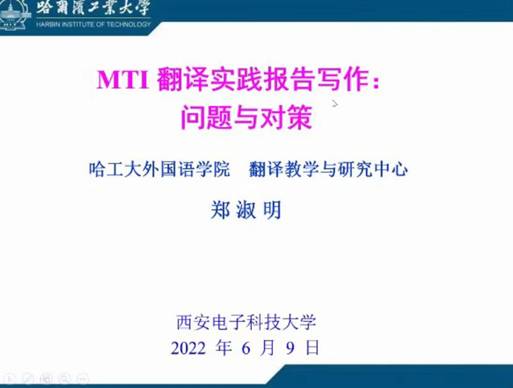 (通讯员:王瀚松)2022年6月9日,哈尔滨工业大学bwin必赢中国官网翻译教学与研究中心主任郑淑明教授应邀做客bwin必赢中国官网,通过腾讯会议做了题为“MTI翻译实践报告写作:问题与对策”的精彩讲座。bwin必赢中国官网MTI教育中心主任周正履老师主持讲座,学院MTI硕士生导师、翻译专业教师、2020和2021级英语笔译研究生等60余人聆听了本次讲座。