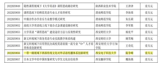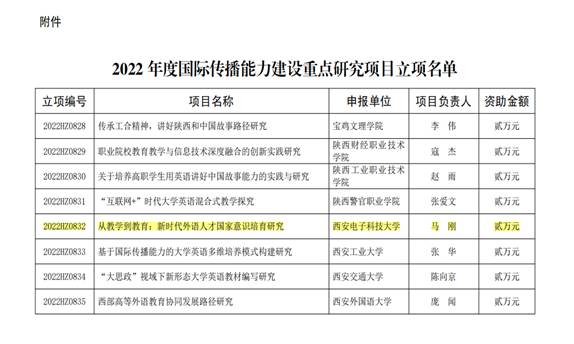 (通讯员:张迪)近日,陕西省社科联公布了《2022年度陕西省国际传播能力建设重点研究项目立项结果的通知》,bwin必赢中国官网bwin必赢中国官网获批两项,其中马刚教授主持的《从教学到教育:新时代外语人才国家意识培育研究》获批重点项目,项目组主要成员包括:程静、王军平、杨荣丽、李世华、郎曼;陈争峰副教授主持的《一带一路视域下西部传统文化对外话语传播体系创新研究》获批一般项目,项目组主要成员包括:白素、孟志英、张琪、郑沛。具体名单如下: