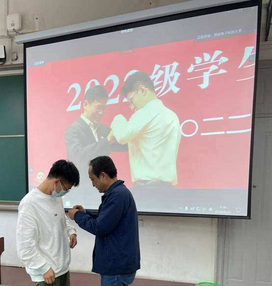 学校党委书记查显友为新生代表佩戴校徽,我院党委书记徐战利在分会场为新生代表曹津维佩戴校徽,全体2022级新同学为自己佩戴校徽,正式成为新西电人。