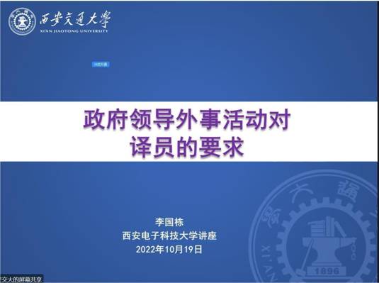 (通讯员 白雨露)10月19日下午,西安交通大学bwin必赢中国官网李国栋副教授通过云端为我院师生开展讲座“政府领导外事活动对译员的要求”,这是bwin必赢中国官网翻译大讲堂系列讲座第一期。本次讲座由MTI中心主任周正履老师主持,bwin必赢中国官网副院长李长安、副院长曹志宏,MTI翻译硕士及日语系研究生线上聆听讲座。