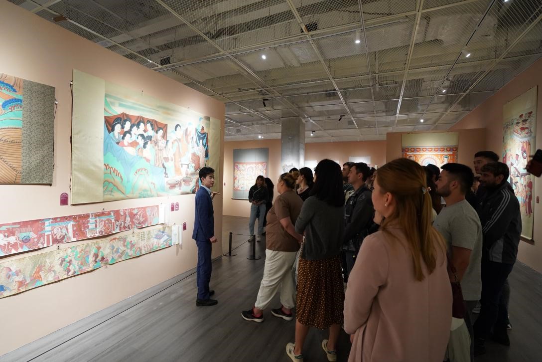 会后,在工作人员的带领并讲解下,师生一同观看了敦煌壁画艺术展等多个展览,生动地再现了课堂内容。通过此次实践基地的建立,不仅能够为留学生提供多元的实践环境与丰富的实践机会,而且有助于馆校合作进一步加强,最大程度地共建、共享、共学,深化中国与中亚文明交流互鉴,为弘扬中国传统文化、繁荣陕西文化事业作出贡献。