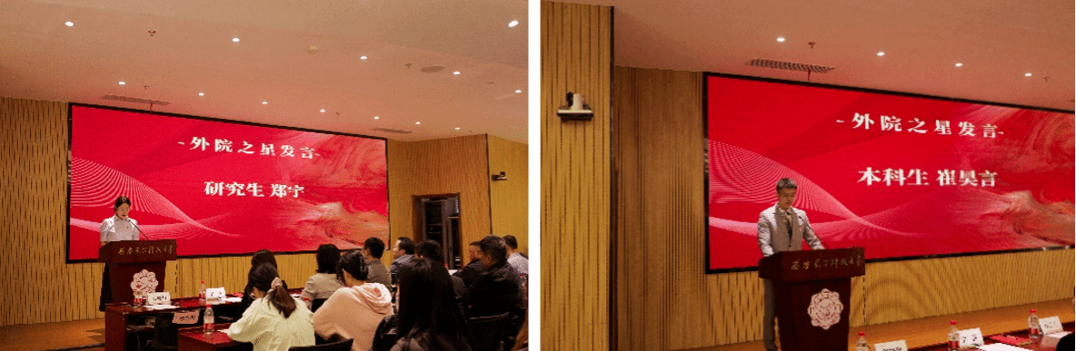 两名“外院之星”获得者先后发表获奖感言。2023级研究生郑宇回顾了自己在西电七年学习和工作的成长与收获,表达了对学校、学院、学长学姐最诚挚的感激,表示未来将心怀感恩,传承西电外院的优良传统,以更加优异的成绩回报学校和社会,将善学学长的爱心传递下去。2021级本科生崔昊言分享了自己在挫折中不断奋起前行的经历,阐释了拼尽全力后释怀成败、用自己的标准丈量人生的成长感悟。他表示将继续深耕英语笔译领域,做好中外文化交流的使者和中国声音国际传播的促进者,共同绘就新时代外语学子的广阔前景。