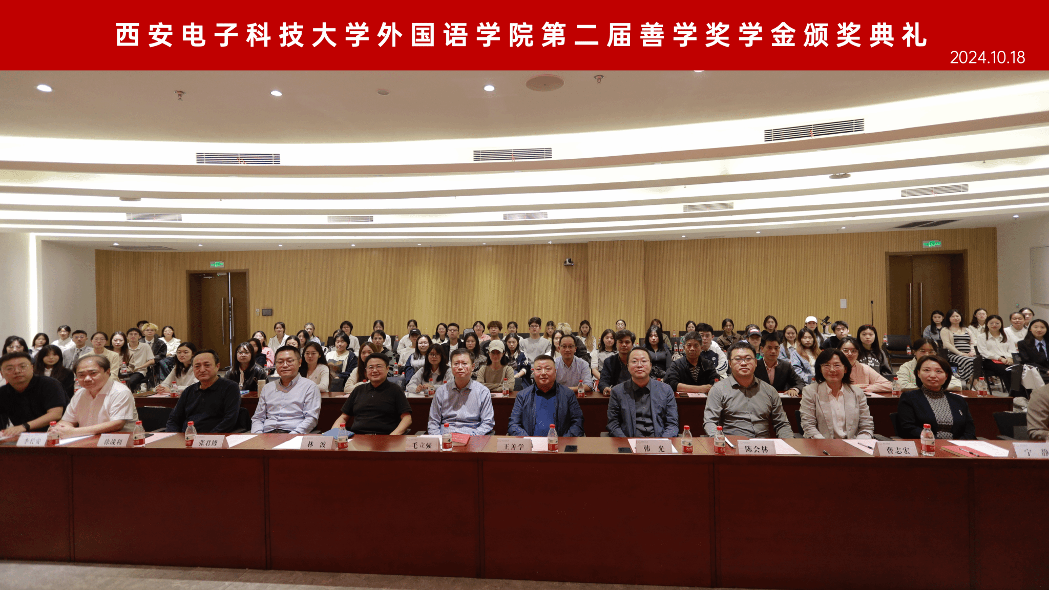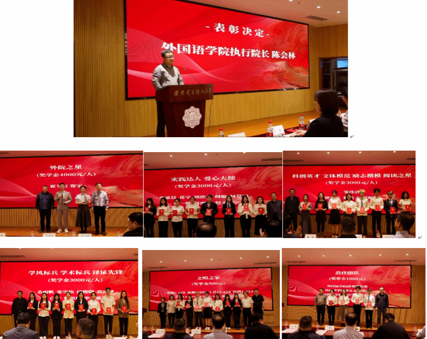陈会林宣读表彰决定并对获奖的同学们表示衷心的祝贺。第二届善学奖学金表彰奖励外院之星2名,“学术标兵”“励志楷模”“科创英才”“爱心大使”“文体模范”“译证先锋”“阅读之星”和 “实践达人”等个人单项24名,最佳学生团队4个,文明之家7个,共覆盖132人,占在校学生的28%。在颁奖环节,获奖学生及团队代表依次上台,出席典礼的领导嘉宾为他们颁发奖杯和荣誉证书。