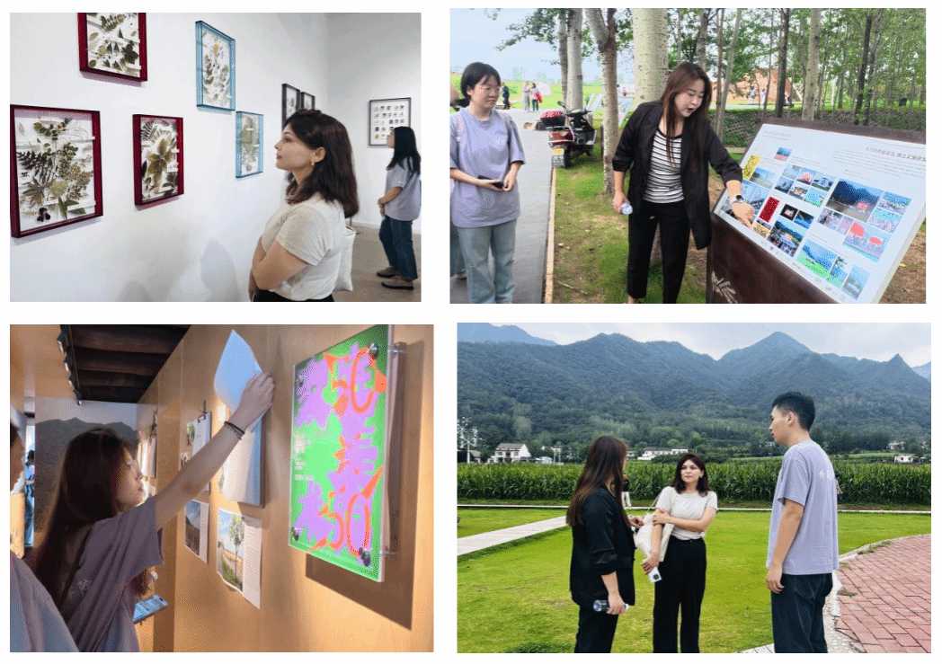 活动首站,师生们集体参观了蔡家坡美好生活服务中心。蔡家坡村村代表丁老师介绍了该中心依托乡土资源打造的特色民宿服务以及门前辽阔的葡萄产业园,让大家直观体会到农旅融合促进乡村发展的创新模式。随后,队伍走进村史馆,馆内珍藏的老物件与历史照片,无声诉说着村庄的时代变迁,而墙上和展台上陈列的美院学生采风创作的艺术作品,尤其是蔡家坡的非遗版画与剪纸展区,更是吸引了同学们驻足欣赏、热烈交流。紧接着,大家来到终南剧场。丁老师深情讲述了该剧场连续承办多届“关中忙罢艺术节”的精彩历程,让同学们对乡土文化在现代社会的创造性转化有了更深的认识。在艺术村长之家和乡村书屋中,师生们进一步感受到艺术赋能乡村、文化促进治理的生动实践,体悟到乡村公共空间所带来的社区凝聚力与发展活力。