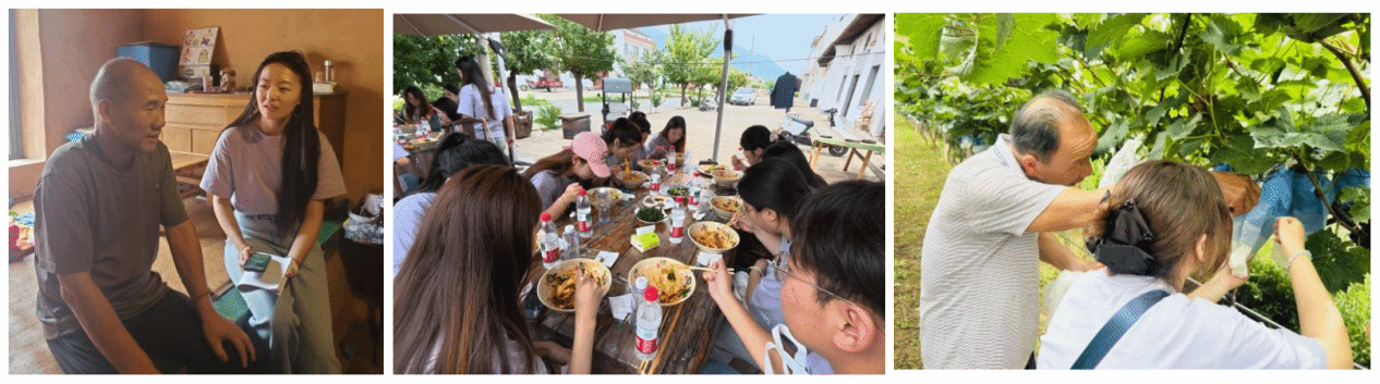 实践环节中,师生共同体验了用忙罢节后新收麦子手工制作乡村面条,亲身感受传统农耕饮食文化的延续与魅力。大家还走进葡萄园参与采摘,以实际行动支持乡村特色产业发展。通过与村民面对面交流,同学们深入了解到蔡家坡村在民生改善、文化传承与产业升级等方面的具体举措,增强了实践教育的真实性与感染力。