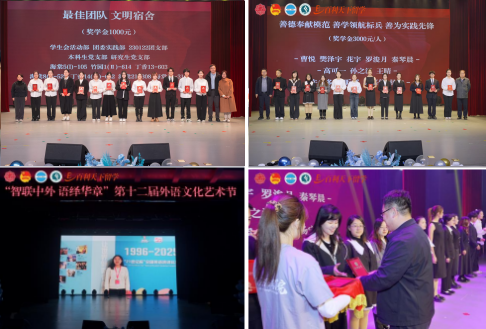 此次艺术节还进行了第三届善学奖学金的颁奖仪式。5个“最佳团队”、7个“文明之家”、12位“善学先进个人”和1位“外院之星”。备受瞩目的最高荣誉“外院之星”由2022级翻译专业魏思琪同学夺得。虽远在杭州征战全国英语演讲大赛,她仍通过实时连线分享感言,展现了外院学子的卓越风采。学院领导为获奖者一一颁奖,勉励获奖学子以勤学为舟,以善思为帆,在融通中外的征程上砥砺前行。