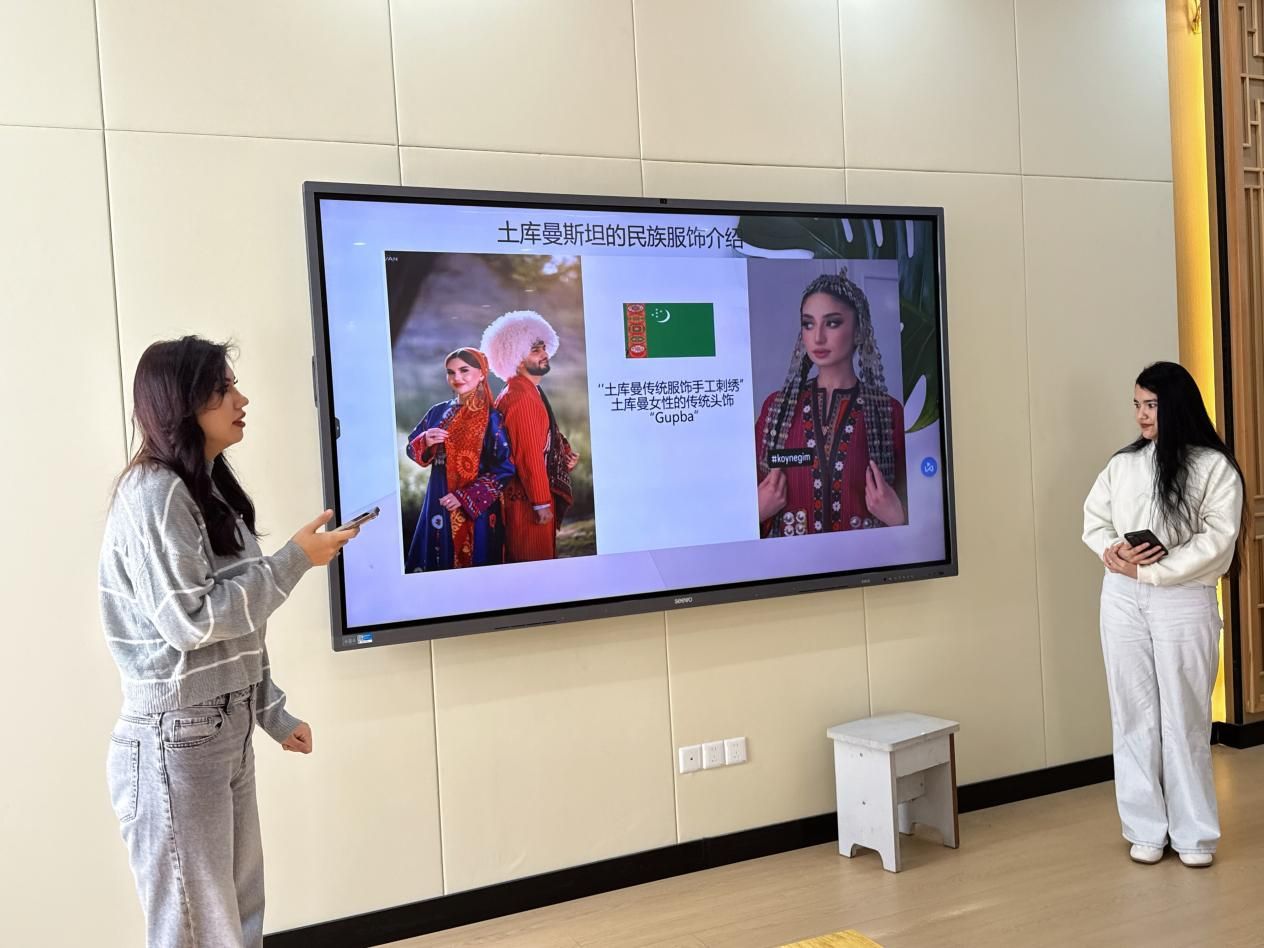 来自意大利的玛蒂雅率先带来展示,为大家介绍了意大利的传统服饰。她详细讲解了不同地区传统服饰的差异,从北部伦巴第地区精致的刺绣马甲,到南部西西里岛色彩艳丽的印花长裙,不仅展示了服饰的款式细节,更分享了服饰上纹样、色彩所蕴含的地域文化特色,让大家真切感受到意大利传统服饰的浪漫与精致。中国学子王佳奕身着一袭典雅的汉服登场。她从汉服的形制演变讲起,详解了襦裙、褙子等经典款式的特点,层层深入地展现了汉服的端庄韵味与中华传统文化的深厚底蕴。来自土库曼斯坦的海灵及同伴携手亮相,带来了土库曼民族服饰的特色展示。有精美刺绣的民族长袍,男子头戴装饰着银饰的传统帽子,还特别解读了服饰上象征吉祥的图案寓意,让在场学子深入了解了土库曼斯坦民族服饰的独特魅力与文化象征。