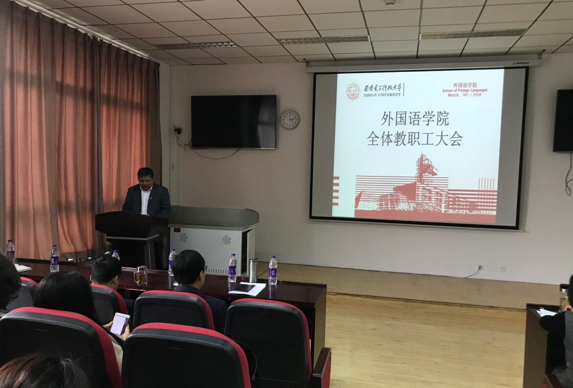 会上,党委书记杨跃首先向全体教职工汇报了学院领导班子民主生活会开展的情况,并对学院民主意见征集结果做出了反馈解答。接着,他对个人工作情况开展述职。他说,2017年在全院师生员工的共同努力下,出色的完成了学校布置的各项任务,在许多方面有创新、有突破、有亮点。在这一年,学院圆满完成本科教学审核评估工作,完成了一级学科自评工作,外国语言文学一级学科增列获批;“英语”专业获批陕西省一流培育专业;“科技英语”校级在线开放课程结题优秀,推荐上线“中国大学MOOC”平台;大学英语二部党支部《“深学”凝心聚力,“真做”推动发展》代表学校参加了全国高校“两学一做”风采展示活动。他表示,这些成绩与外院领导班子和全体外院大家庭成员的不懈努力是分不开的,是属于大家的共同成果,希望大家2018年再接再厉取得更好成绩。