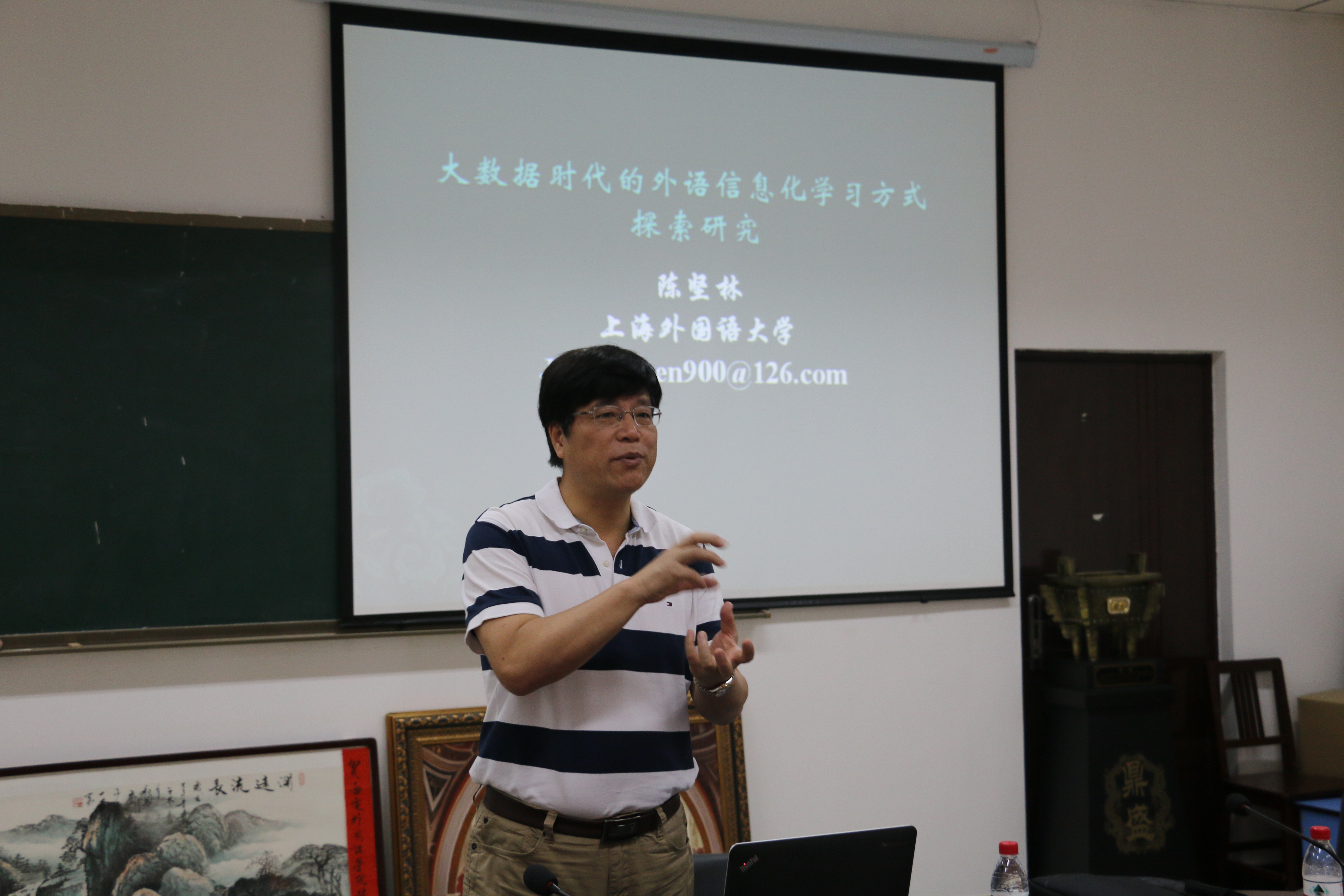 聘任仪式后,陈坚林教授作了题为“大数据时代的外语信息化学习方式探索研究”的学术报告。在报告中,他首先引入当前的研究热点“机器学习”,随后便围绕大数据、信息化时代的外语学习及大数据对外语学习带来的机遇和挑战进行了详细阐述。