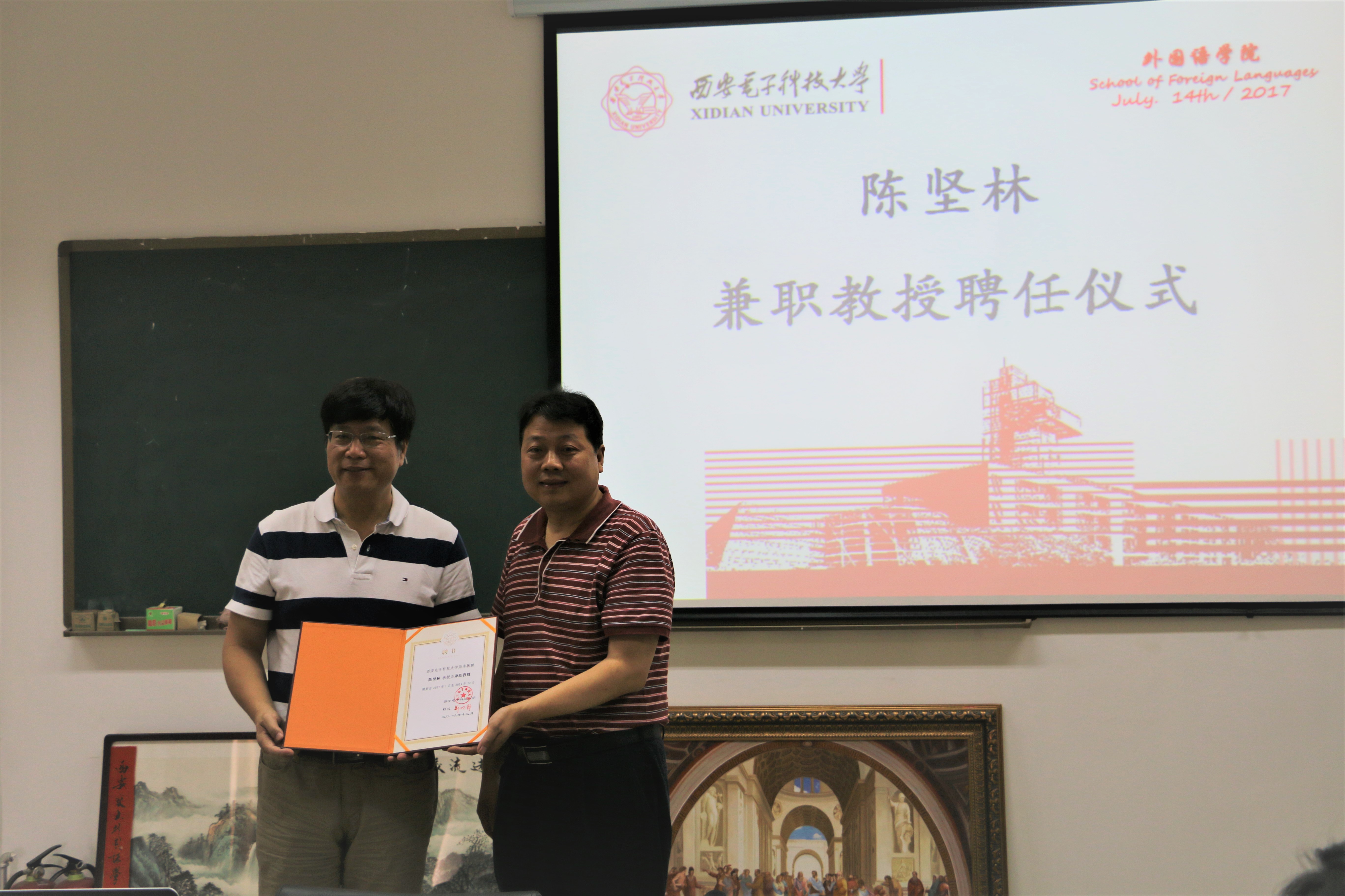杨跃对陈坚林教授作了简要介绍,对他长期以来在学科建设、人才培养、科学研究等方面给予bwin必赢中国官网的帮助表示感谢。周燕来代表学校宣读了聘任决定,为陈教授颁发了聘书。英语系教师秦枫博士也发表了感言:“博士期间能进入‘陈家班’得到陈老师的指导,感到非常荣幸,陈老师对我们的寄语‘态度、意识、勤奋’成就了我现在的科研精神,他倡导的‘快乐学习、快乐生活’更让我感受到了学习就是生活中最大的快乐。”陈坚林教授表示,bwin必赢中国官网是我党我军创建的一所高水平大学,受聘兼职教授既是一种荣誉,更是一份责任,“我将切实履行兼职教授的职责,为西电bwin必赢中国官网的发展贡献自己的力量。”