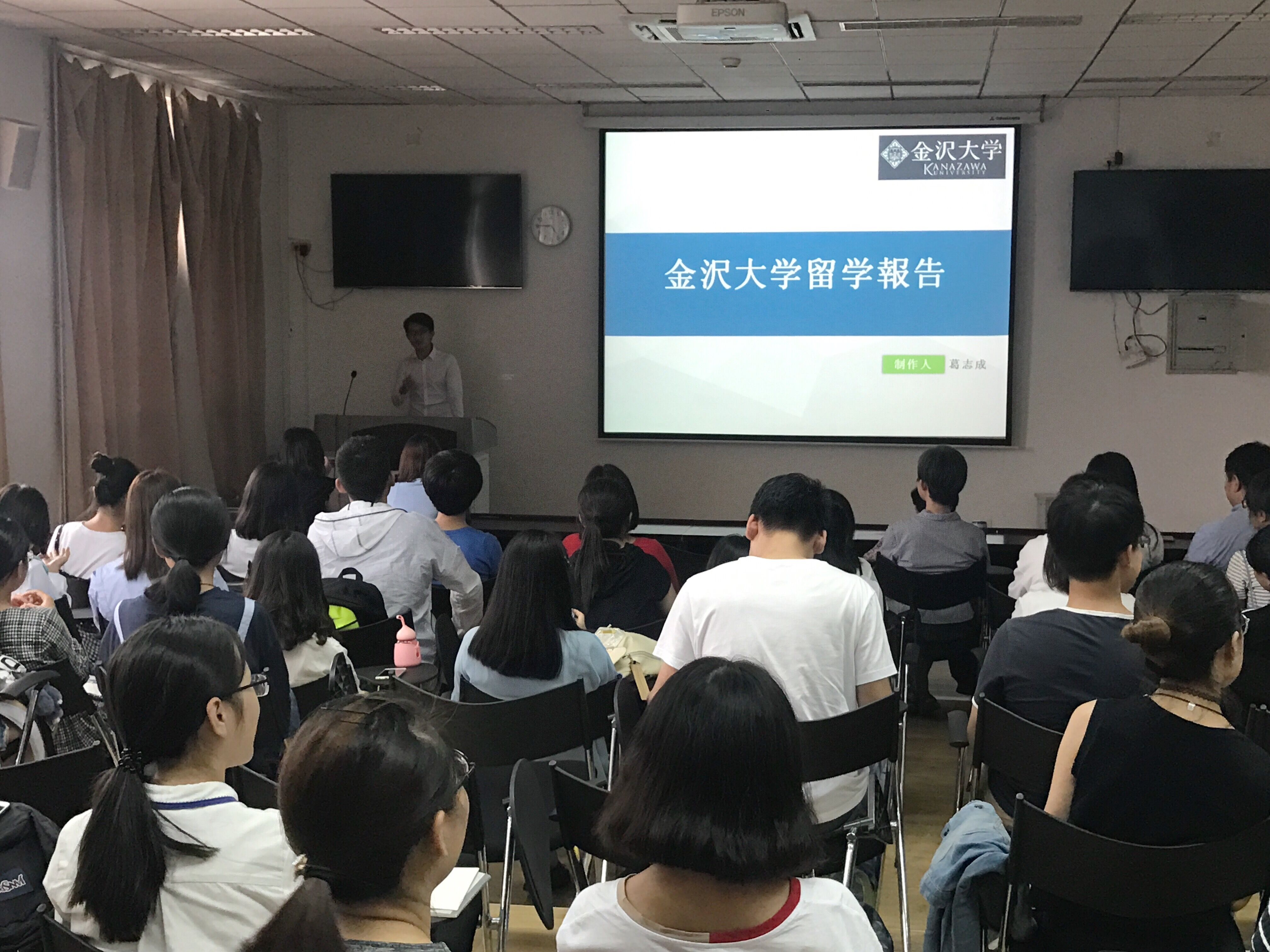 在留学报告环节,今年4-8月间赴日本金泽大学留学归来的日语系系四年级学生葛志成、王晨、王喆三名同学分别介绍了自己的留学经历和体会。报告涵盖了学校概况、留学项目、课程体验、文化体验、生活情况等方面的内容。三人一致认为此次留学很有意义,收获颇丰,并强烈建议在场的同学们积极参与留学项目,去实地体验和了解日本的语言和文化。三名同学图文并茂的报告和生动风趣地讲解,激发了现场其他年级同学对赴日留学的浓厚兴趣。近年来,日语系着力加大对外合作交流,为学生成才便利条件,进一步提升了日语人才的培养质量。
