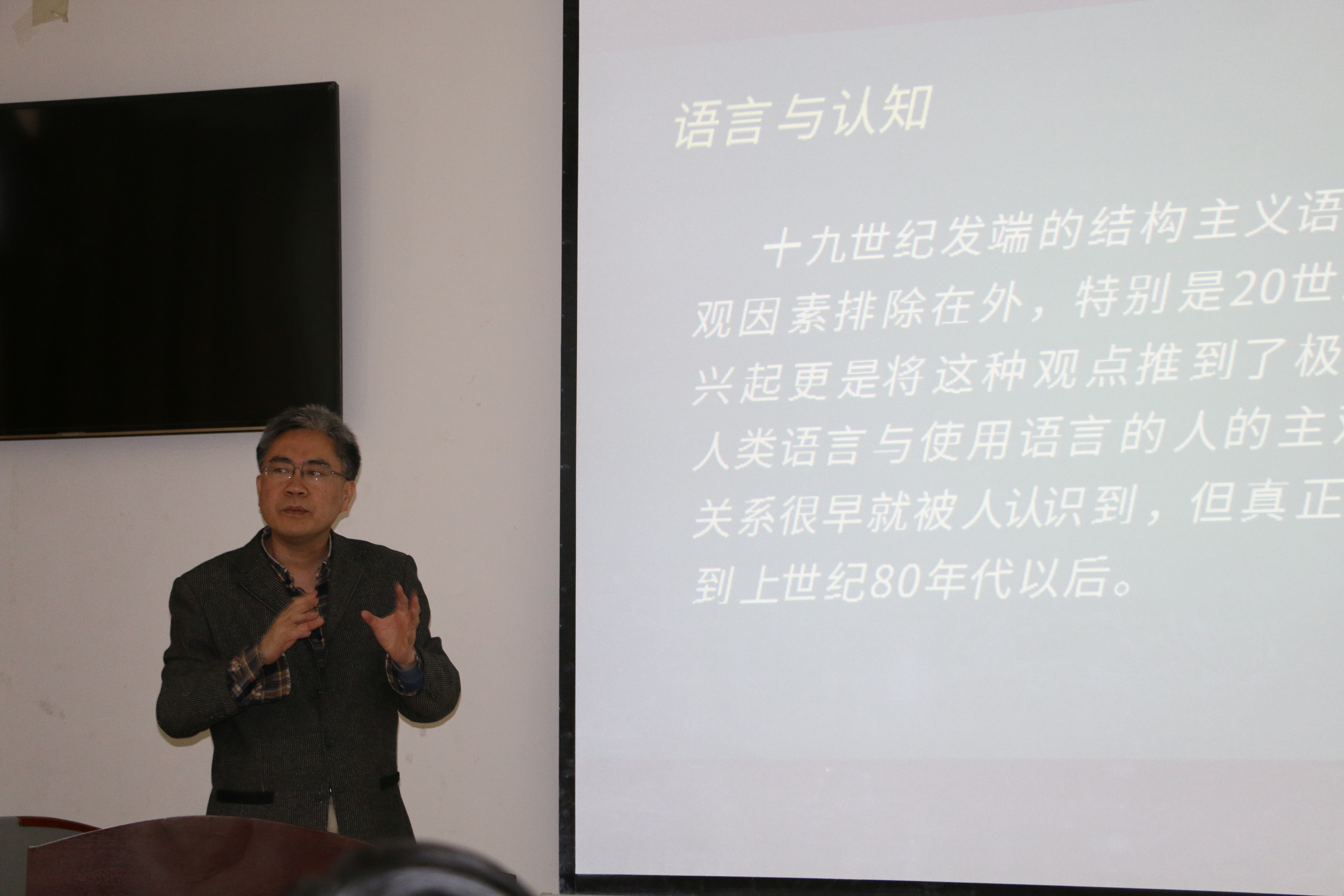 全长两个小时的讲座从日本作家止庵对日本文学的细节之美的研究谈起,借用日本文艺评论家加藤周一的作品《日本文化中的时间与空间》(日本文化における時間と空間)导入主题,即语言中的临场感和体验性。为便于理解,潘教授着重介绍了认知语言学的基本内容,从起源、发展、基本理论,谈到“识解”以及开展认知语言学研究的必要性。