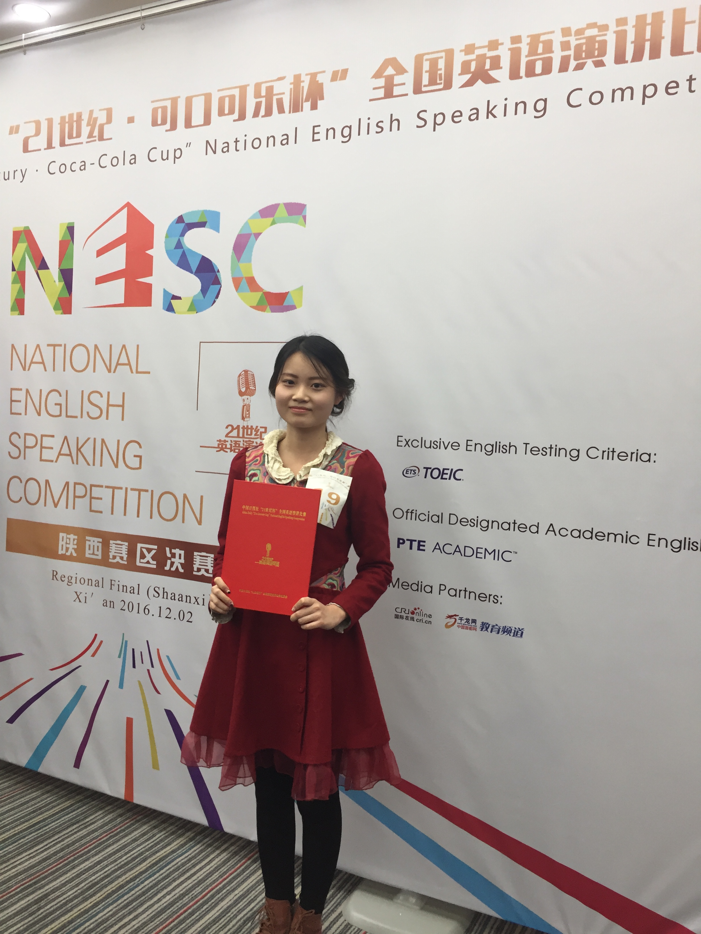 (通讯员 王美璇 邹甜甜)12月2 日,“21世纪·可口可乐杯” 全国大学生英语演讲比赛陕西赛区总决赛在西北工业大学隆重举办,大二英语专业王美璇同学代表我校征战。