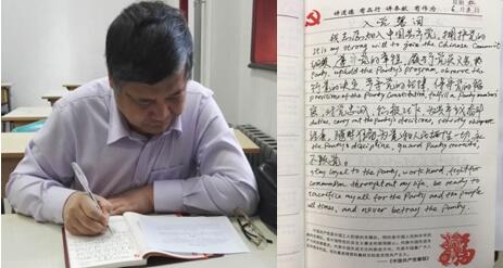 “It is my strong will to join the Communist Party of China, uphold the Party's guideline, observe the provisions of the Party’s constitution, fulfill a Party member's duties, carry out the Party's decisions, strictly follow the Party’s disciplines, guard the Party’s secrets, stay loyal to the Party, work hard, fight for communism throughout my life wholeheartedly, keep ready at all times to sacrifice my all for the Party and the people, and never betray the Party.”
