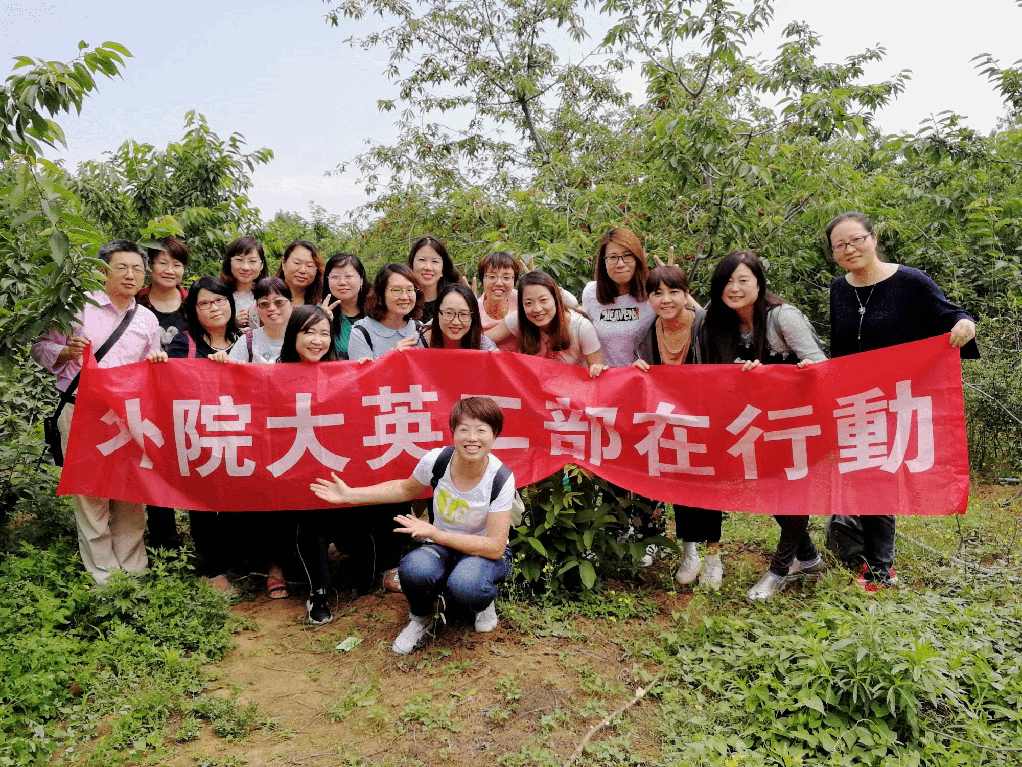 活动当天,时值夏初,天朗气清,阳光明媚,生机盎然,正是野外踏青、感受自然风光的大好时节。大英二部教职工坐车抵达此行第一个目的地——白鹿印象樱桃园,黄土台塬,居高临下,果树成林。走进樱桃园,一颗颗樱桃隐藏于绿叶之间,像一盏盏火红的小灯笼,让人欢欣喜悦。樱桃树下,大家一边品尝,一边看蓝天上白云悠悠,听着农民师傅的热心介绍,体味着果实的香甜,体味着种植的艰辛。田园之中,大家情不自禁放松身心,怡然自得。