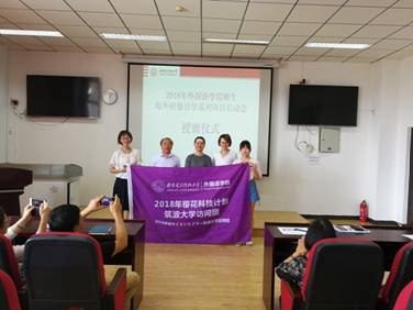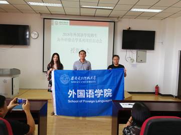最后,学院领导分别给参加暑期海外研修的各个团队授团旗。 翻译系主任仝文宁、大英一部副主任辛冀秋、日语系王金博老师以及刚刚结束了在美国密苏里西部州立大学一年交换学习的15级翻译系王心怡同学与大家分享了各自海外学习的经历和感悟,并对即将赴海外研修的师生们提供了很多好的建议。