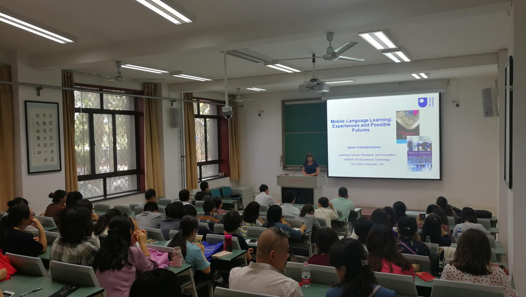 按照行程安排,讲座于9月21日下午14:30准时开始,bwin必赢中国官网副院长马刚教授主持,来自bwin必赢中国官网的老师和一、二年级的专业研究生以及其他学院的相关老师、学生一百余人聆听了此次讲座。在讲座中,Kukulska-Hulme对语言移动学习进行了介绍,分析了其发展态势,展示了语言移动学习方面的最新成果,并分享了如何进行语言移动学习教学方面的科学研究的经验和体会。专家的讲座充分引起了在座师生的兴趣,讲座过后,很多老师与学生踊跃提问,专家都给与了详尽的解答。