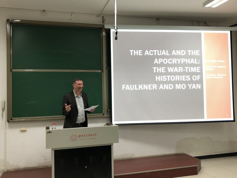 第二个话题为“The Actual and the Apocryphal: The War Time Histories of Faulkner and Mo Yan”。由于对莫言作品的熟知,这个题目也引发了师生们更大的热情。Dr. Rieger首先比较了大的历史背景,社会背景以及两位作家的生长环境,进而以福克纳的《不败者》和莫言的《红高粱》为例,详尽对比了这两部作品的相似之处,进而得出一系列的相关结论。