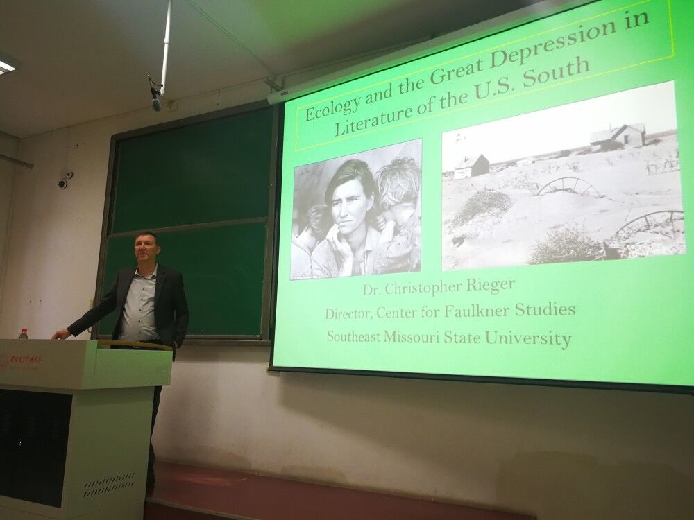 讲座涵盖了两方面的内容。在第一个话题“Ecology and the Great Depression in Literature of the U.S. South”中,Dr. Rieger阐释了美国南方文学如何以生态整体主义为思想基础,以生态系统整体利益为最高价值来考察和表现自然与人之关系和探寻生态危机的社会根源,并选取了Erskine Caldwell, Marjorie Rawlings, Zora Hurstons以及William Faulkner四位作家的几部代表作品,详细解析了不同作家如何以不同手法通过对自然环境的描述来反映和揭示自然,人类以及社会之间的相互关联、相互作用以及所带来的生态问题。在话题最后还为在中国进行类似研究给出了行之有效的思路和建议。