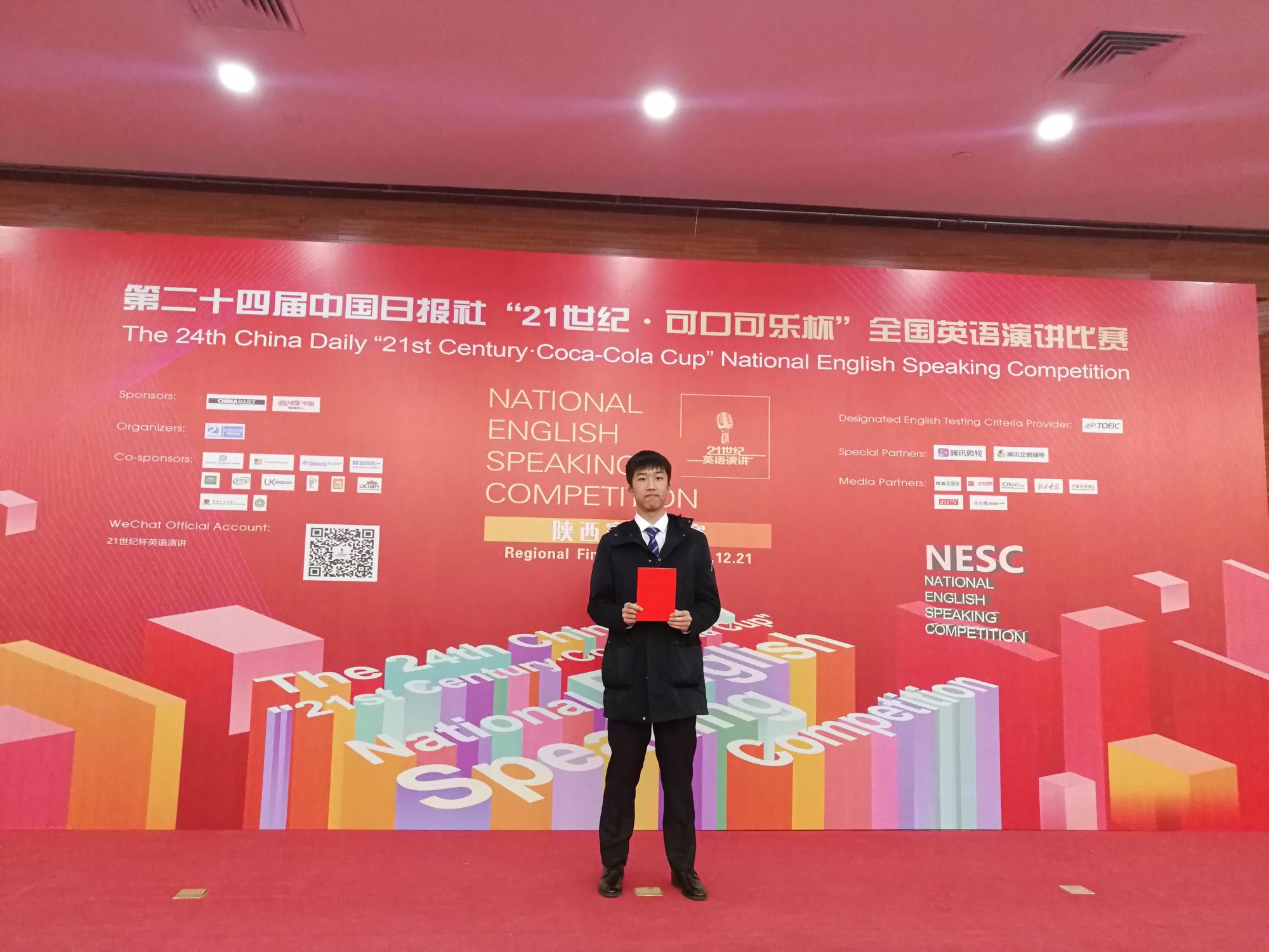 经过一下午的角逐,刘永祎同学排列全场第九名,最终获得第24届中国日报社“21世纪·可口可乐杯”英语演讲比赛陕西赛区的二等奖。