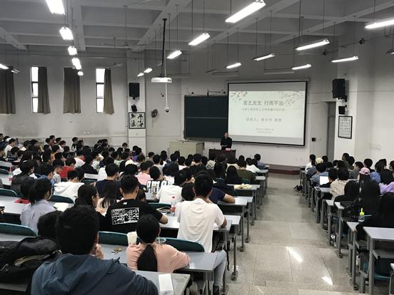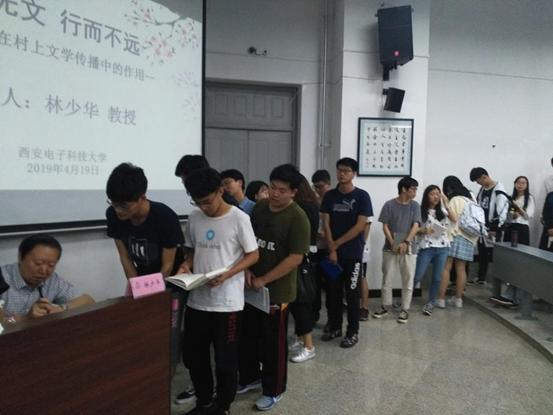 林少华先生的语言风趣幽默,演讲细致精彩,时而另学生们捧腹大笑,时而让大家低头沉思。讲座后,林少华教授与师生们进行了互动,解答了大家一些关于文学的问题。听完讲座后同学们表示,此次集中讲座加深了对文学翻译的理解。最后,林教授与学生们进行了近距离的互动,并为学生们签名。