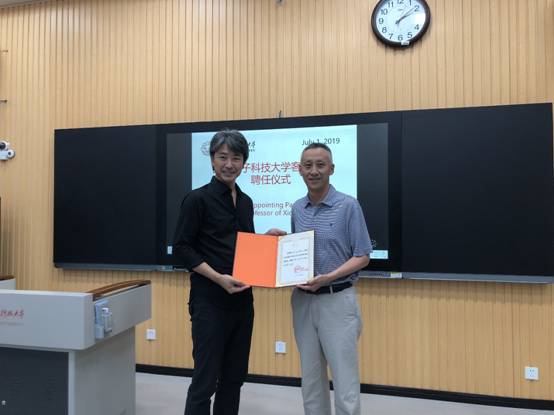 随后校长助理王泉教授宣读了校学术委员会2019年4月聘任Paul Kei Matsuda教授为我校客座教授的决定,并为Paul颁发聘书,佩戴校徽。