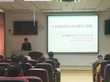 庵教授的研究方向主要为日语语法论、谈话研究等。本次讲座的主题为“日语教育语法的现状与课题”,庵教授以“国语”和“日本语”的区别为切入点,由浅入深,从日语教育语法的成立、日语母语者与非日语母语者的语法、活用母语知识的日语语法等几大方面进行了生动的阐释;在理论阐述的同时,庵教授也列举了很多在日语学习过程中会经常用到的例句以及容易混淆的表示处所的格助词,用日语、汉语、英语对比的方式对其进行了细致的讲解说明。