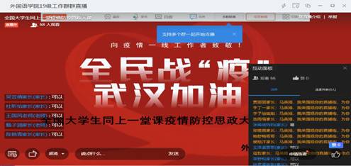 (通讯员:林蓉、马英博)3月9日下午,在全国人民万众一心做好新冠肺炎疫情防控工作的特殊时刻,bwin必赢中国官网19级辅导员张卫国、林蓉和全体同学(共90名)共同观看了教育部社科司和人民网联合组织的“全国大学生同上一堂疫情防控思政大课”的课程直播。