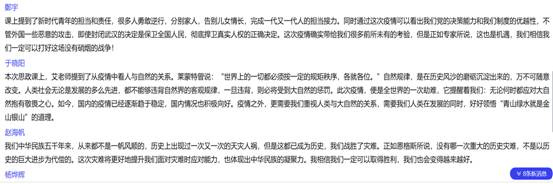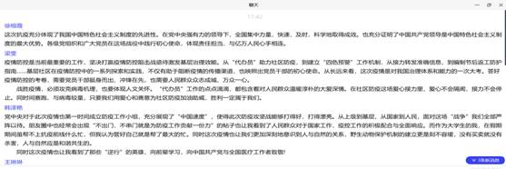 学习这场别开生面的思政大课,党员们既有态度,亦有成果。在进行学习讨论时,党员李佳睿同学说“疫情的爆发是一次磨难,也是一场考验。在疫情防控工作中,我们的国家展示了强大的制度优势和治理效能。面对疫情我们不能慌张,要遵从党与国家的工作安排,努力为这次防疫保卫战做出贡献。”谈到中国青年的责任与担当,翻译专业党员杜亚鹏同学说“这次疫情中,有1.2万90后00后年轻人在武汉一线协助医护人员共同抵抗病魔。90后甚至00后的年轻人会通过一次次的磨难变得更加成熟,祖国的未来会由我们担当起来,请祖国和前辈们放心。”在之后的讨论中,其它党员也踊跃在聊天界面上分享自己的学习感悟。