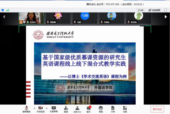 (通讯员 郭晓华 任利华)4月27日下午14:30-16:00,bwin必赢中国官网腾讯会议教学沙龙系列活动的第三场讲座如约而至,科技英语教学团队成员任利华副教授做了“基于国家级优质慕课资源的研究生英语课程线上线下混合式教学实践——以博士《学术交流英语》课程为例”的主题分享活动,全院六十余名教师参与并积极互动,反响热烈。