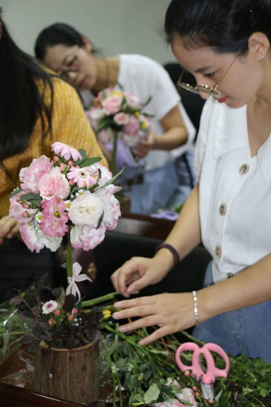 活动开始,花艺老师对插花艺术进行了细致的讲解,介绍了插花的基本结构和造型技法,帮助大家识别桔梗、粉佳人、扶郎、梦幻泡泡等花材以及花艺修剪处理的方法,并为大家示范插花步骤。