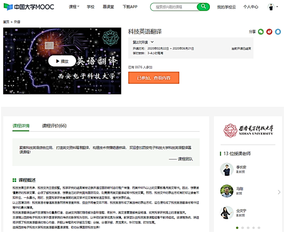 《科技英语翻译》课程由我院科技英语省级教学团队开发,在学院执行院长马刚教授的规划带领下,课程负责人李长安副院长的主导下,主讲教师仝文宁、周正履、王燕萍、曹志宏、任利华、张明、孙玲玲、张鹏华、马琪、朱琳菲、弥晓华等团队成员拼搏进取,攻坚克难,经过两年多时间辛勤建设,于2019年秋和2020年春,分别上线中国大学MOOC平台和中国高校外语慕课平台,为疫情期间和后疫情时代线上授课的普及提供了优质教学资源。