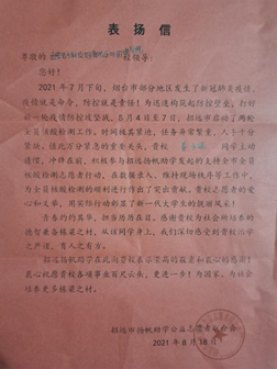 信中写到“青春灼灼其华,担当历历在目。贵校姜冰瑶同学在万分紧急的重要关头主动请缨,冲锋在前,积极参与招远杨帆助学发起的支持全市全员核酸检测志愿者行动。从该同学身上,我们深切感受到贵校治学之严谨,育人之有方,感谢贵校为社会所培养的德智兼备栋梁之才。”